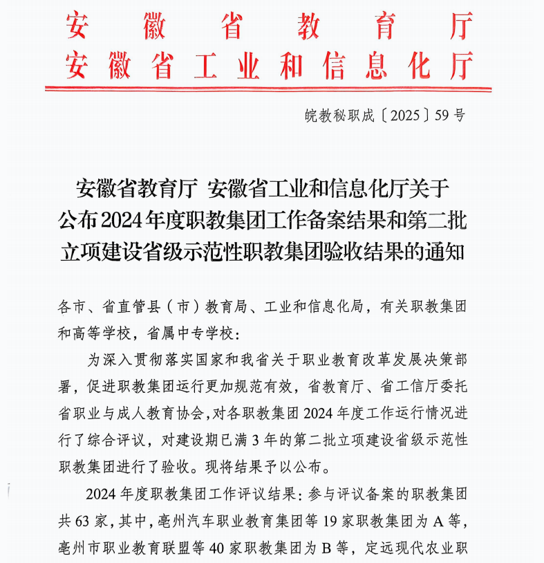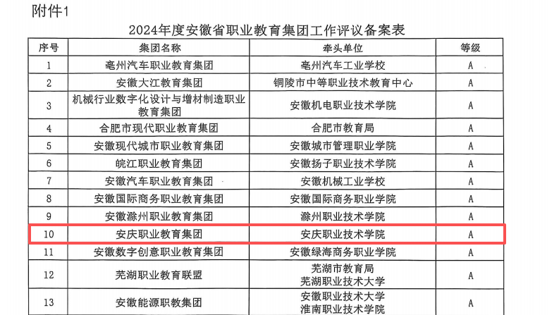近日,安徽省教育厅、安徽省工业和信息化厅共同发文,安庆职教集团在全省63家职教集团2024年度工作运行情况综合评价中,以卓越的表现和显著的成果再度获评安徽省A类职教集团,实现连续七年荣获安徽省A类职教集团称号。